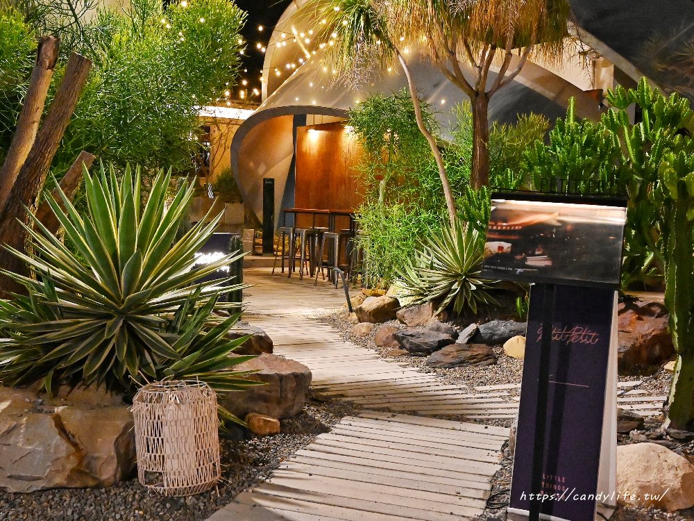 Petit Petit Bar & Coffee位在台中熱門的PARK2 草悟廣場裡,地點雖隱密卻充滿驚喜,從廣場一隅沿著木棧步道走進去,彷彿踏入一座被綠意與燈光包圍的秘密花園,被多肉植物與仙人掌環繞的戶外區,搭配柔和的燈串點綴,夜晚時格外迷人,不說還以為來到了南歐或沙漠系度假小屋,氛圍滿分,也難怪成為近期台中打卡熱點之一