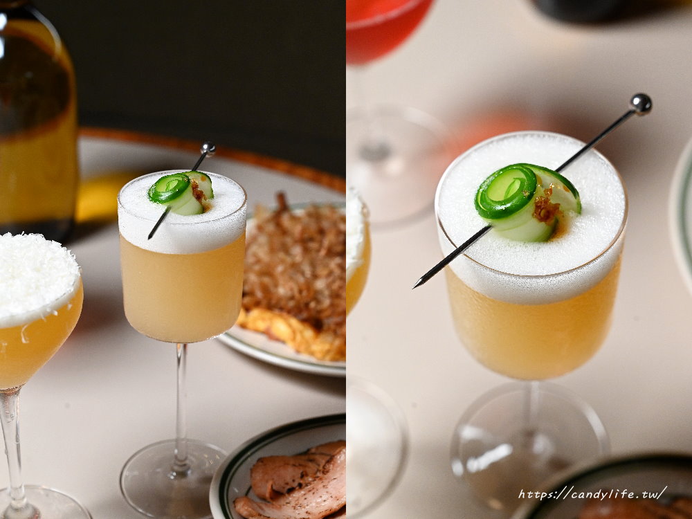這款調酒以台灣當季瓜果為基底,帶出自然清甜的果香,融合四季春的茶韻與玄米茶的細膩油脂感,營造出柔和而層次豐富的口感。琴酒的清爽與香草氣息輕巧支撐整體結構,使茶香與果香相互交融。酒面以炙燒焦糖小黃瓜捲點綴,不僅增添視覺趣味,更帶來微妙的焦香與清涼對比