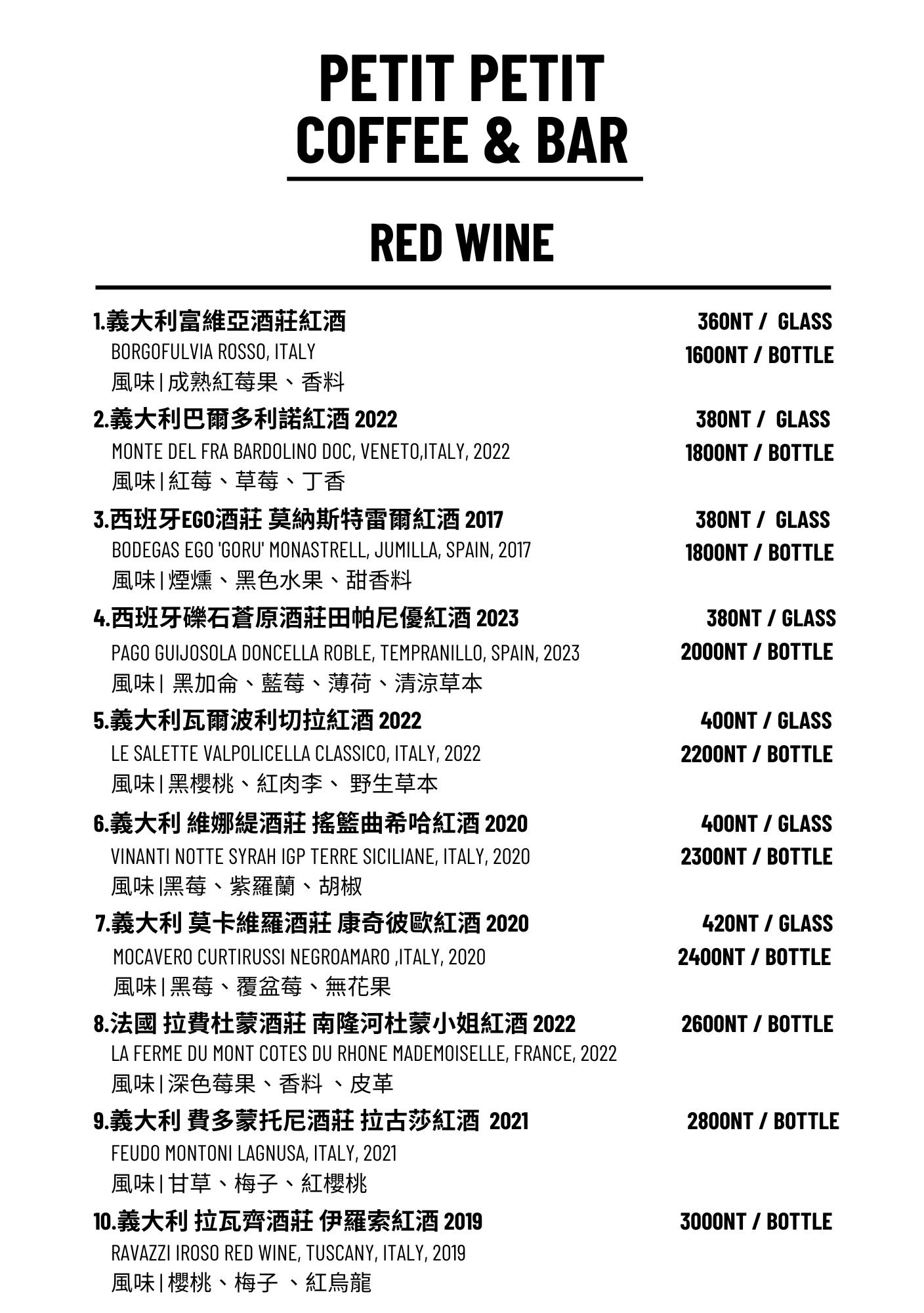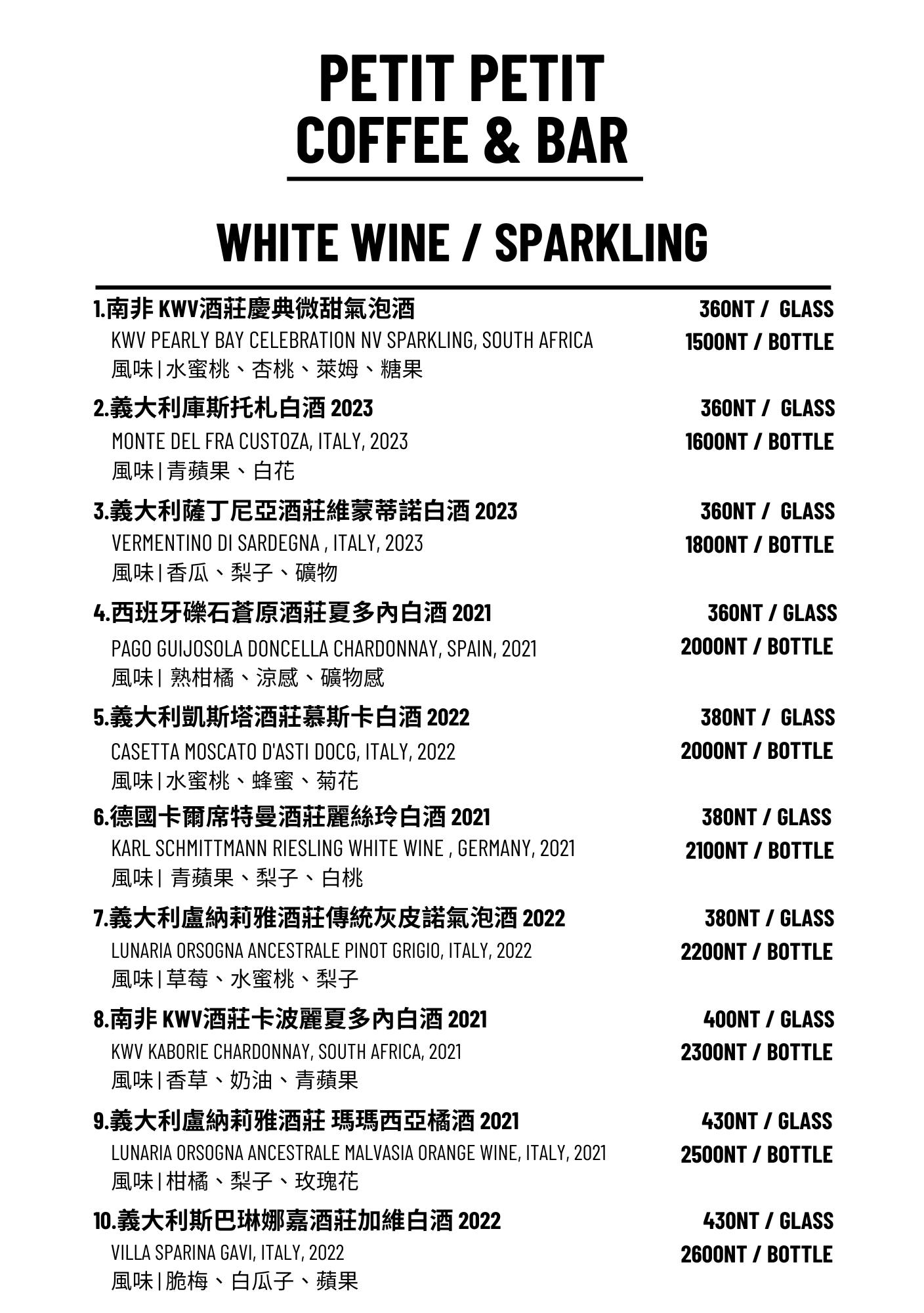 Petit Petit Bar & Coffee的酒單相當豐富多樣,從調酒、紅酒、白酒到氣泡酒應有盡有,無論你喜歡微醺果香還是濃烈風味,都能在這裡找到喜愛的一杯,更貼心的是,還可以請調酒師依照個人口味客製專屬酒品,享受一場獨一無二的味覺體驗