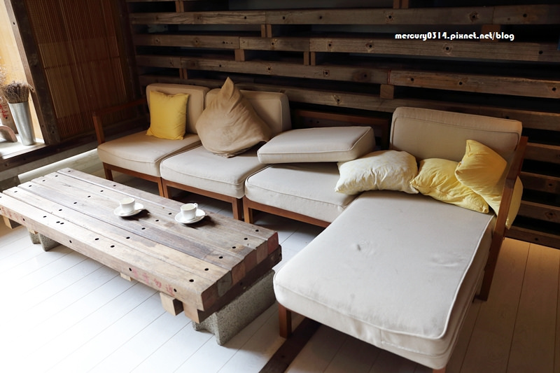 咖啡廳一隅是大沙發座椅,發現木桌和後方木製牆面上方寫著有電勿近,不知道哪裡得來的再利用,讓人覺得滿有特色