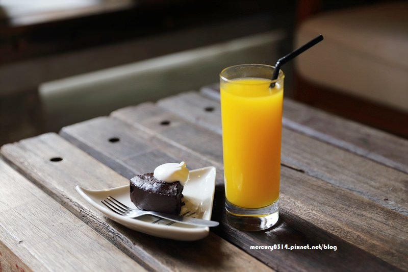 燒巧克力蛋糕+果汁 這是我點的,巧克力蛋糕的口感相當紮實綿密,是可以一小口一小口慢慢品嘗的,小小一塊其實就頗滿足,味道略苦,但巧克力香氣稍嫌不足,上方的奶油,像是奶泡的澎鬆,甜味並不明顯,覺得蛋糕單吃有點乾時,沾點奶油潤濕,口味就大大加分了!果汁是芒果濃縮汁,表現一般般