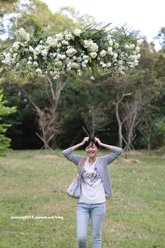 草原上有一個騰空的花束,舉辦戶外婚禮用的吧!!本人在表演洗頭 ((不好笑