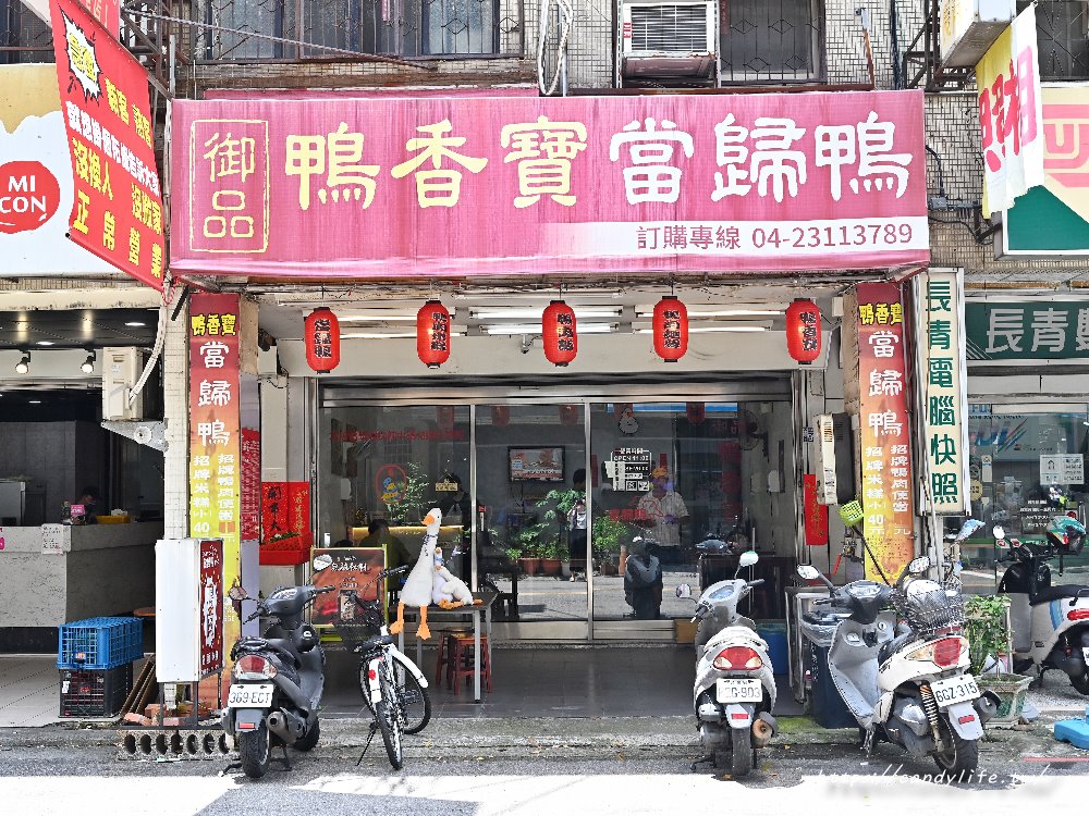 御品鴨香寶當歸鴨位在台中西屯區西屯路二段,鄰近台中捷運文心櫻花站不遠,從扛棒就可以看出店家的歲月痕跡,門口處還有兩隻可愛的鴨鴨迎接大家呢