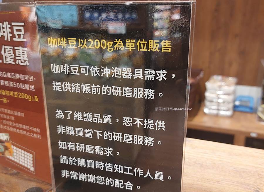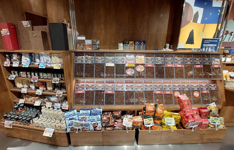 現場販售的咖啡豆在結帳櫃檯旁,以200g為單位秤重賣,購買時若需研磨可直接請店家服務。也有其他袋裝的風味咖啡,選擇很多喔!