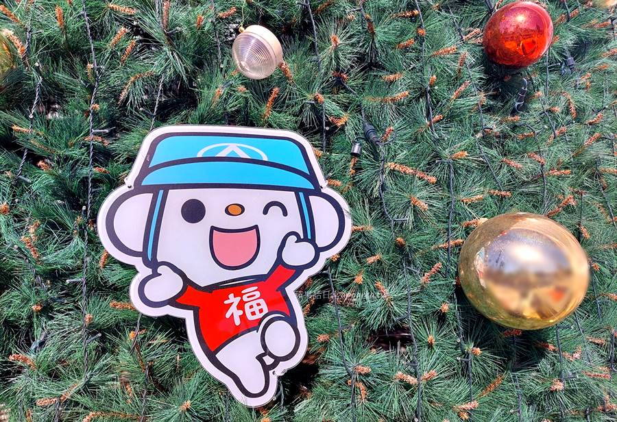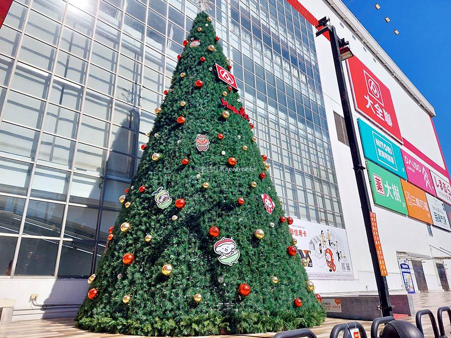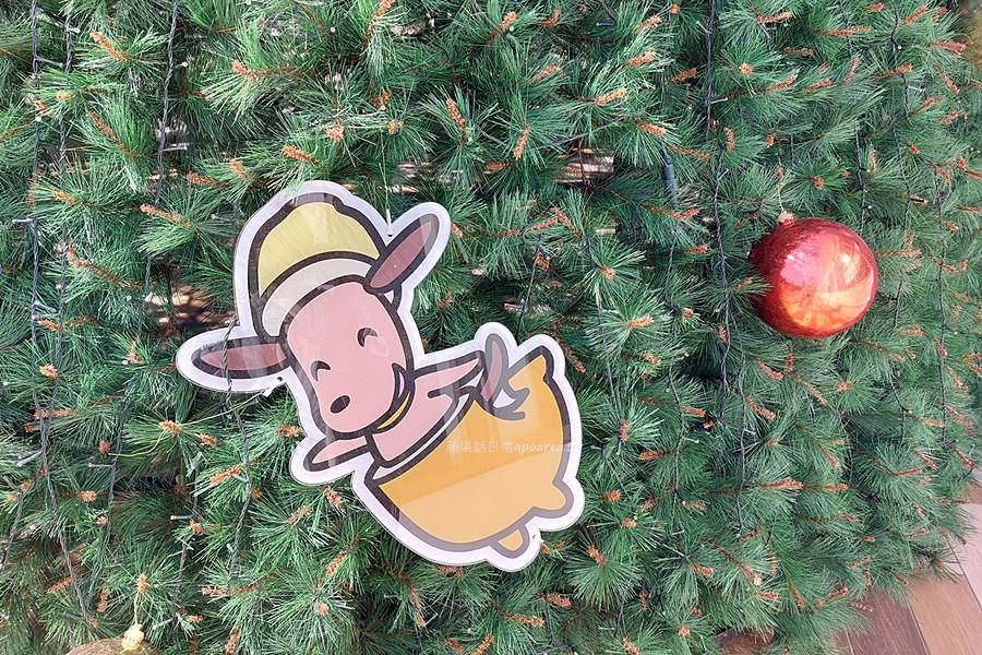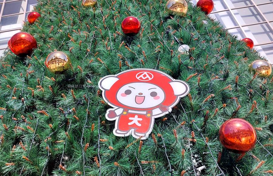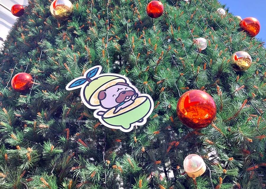 台中免費拍照景點,近3層樓高的繽紛聖誕樹有福利熊和大全熊,還有可愛的水果探險隊蘋狗芒狗奇異狗