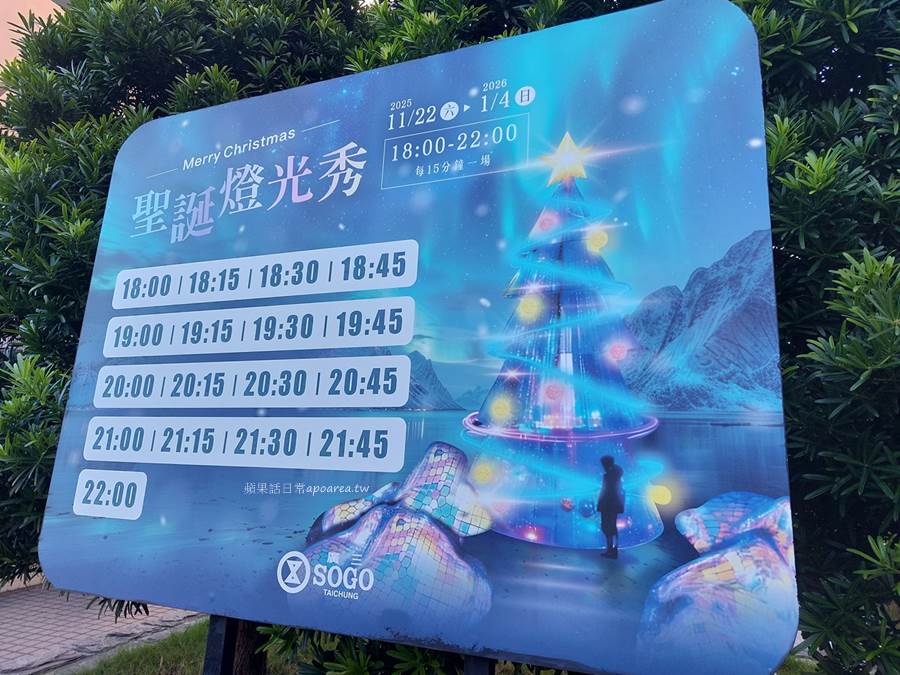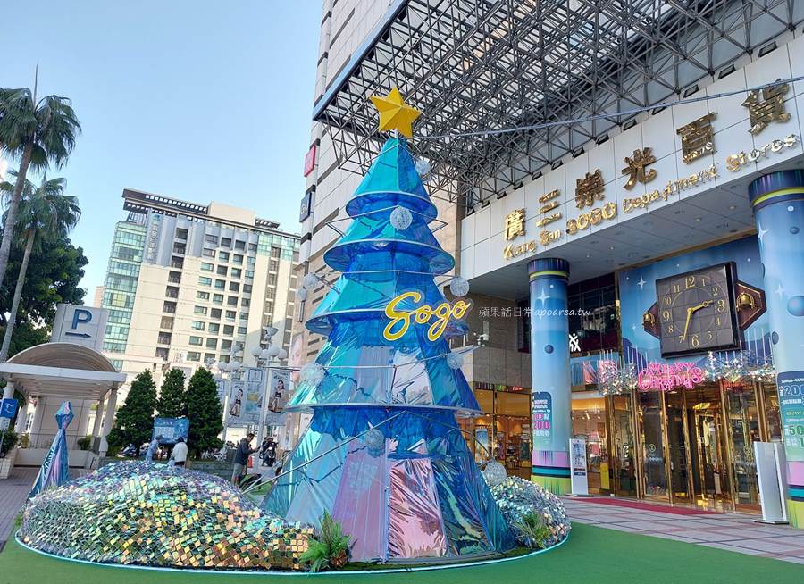 台中廣三SOGO百貨2025聖誕樹也在11月就佈置完成,以「極光聖誕樹」為主題,白天是藍色的,晚上還會有精彩的夢幻光影燈光秀喔!