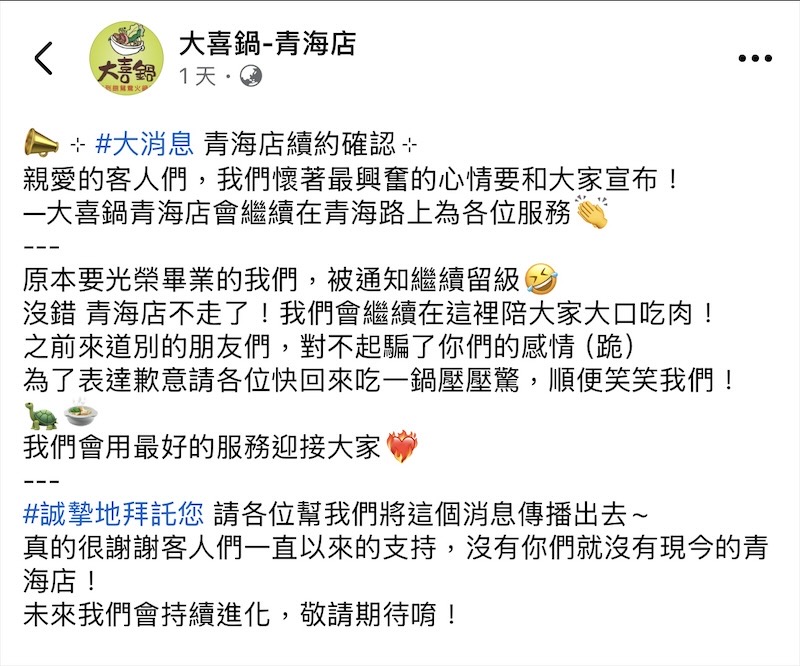 不只青海家樂福有好消息,就連經營近30年的大喜鍋台中青海店也跟著宣佈好消息啦!大喜鍋青海店於昨日在粉絲團發出公告,內文蠻有趣的,寫著原本要光榮畢業,後來被留校察看,意味著大喜鍋青海店繼續為大家營業
