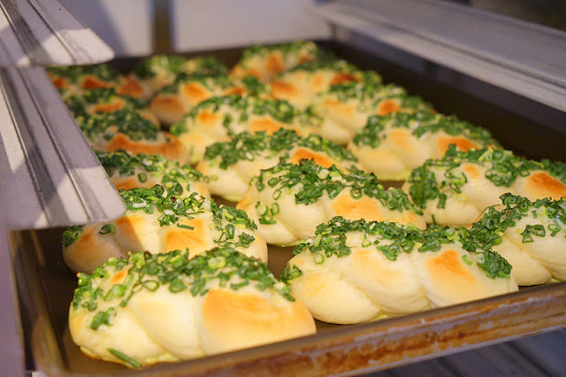 很幸運的是,剛進去時就碰到青葱麵包出爐,熱騰騰的麵包上,滿滿的青葱,一排排的模樣加上剛出爐時蔥的香氣真讓人心動阿。
