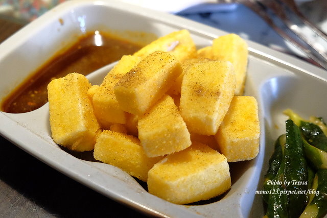 這裡使用的是雞蛋豆腐,外酥內軟,單吃或沾特製的醬汁都不錯