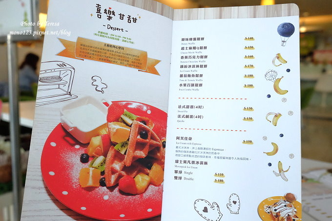 Menu~餐點的選項非常的多,可以從早餐、午餐、下午茶一路吃到晚餐,不過這天用餐過程發生了一個小插曲,可能是下午時分,來用餐的人不多,所以店員也不多,只見店員忙來忙去一直沒過來幫我們點餐,10多分鐘後我們走向櫃台,店員說等等過來幫我們點,過來後店員說,因為鍋子正在清洗,所以餐點都沒辦法出餐,只剩甜點和輕食…其實我們已經選擇好了想吃的餐點,結果要點餐時才被告知沒辦法出餐,所以只能餓著肚子再重新選擇,某人有點小不爽…