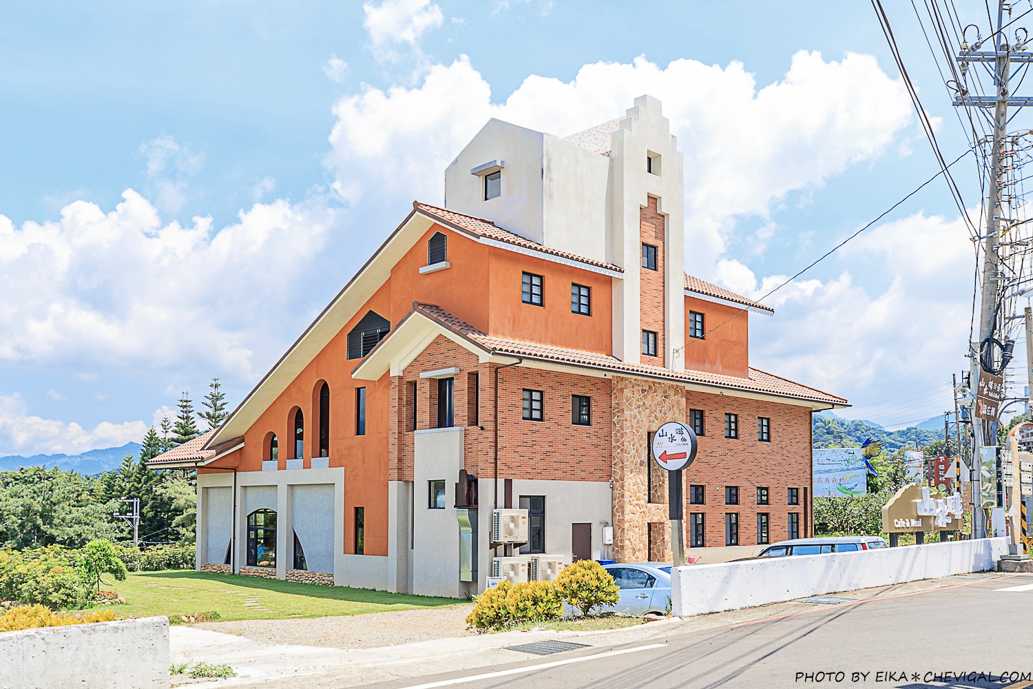 山水啡Cafe&Meal就位在新社區協中街旁,距離知名的新社古堡也不會太遠,從遠遠的地方就能看到這棟橘白色的獨棟建築;雖然園區其實並不算太大,但是本身有提供停車場,還挺方便的。