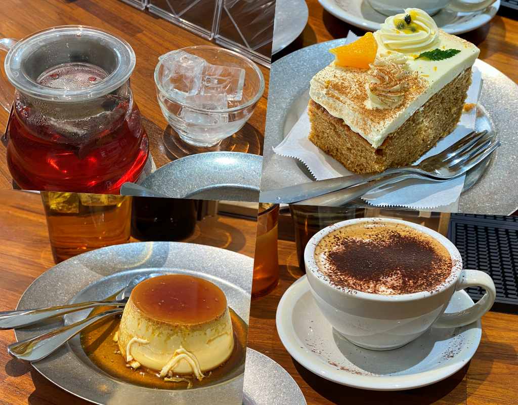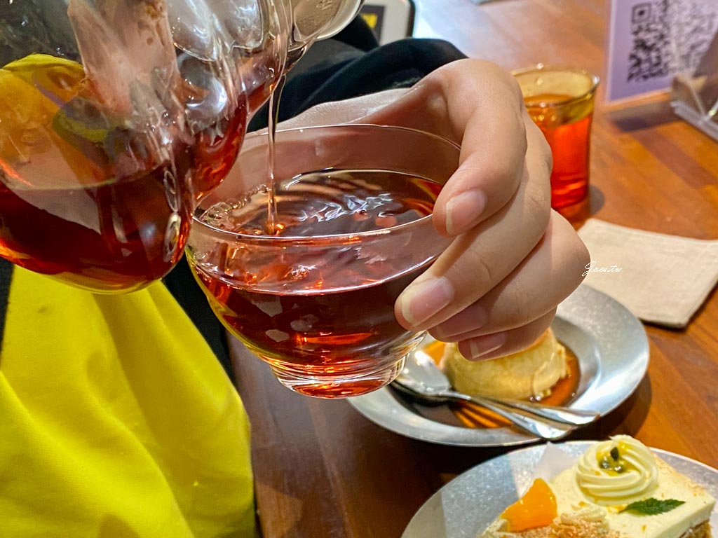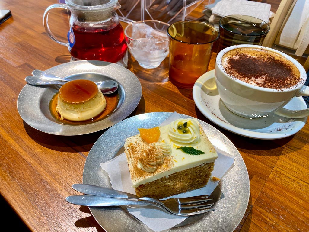 入座後有提供飲水 ,此張照片內有摩卡/莓果茶/昭和式布丁與桂韻乳酪蛋糕。