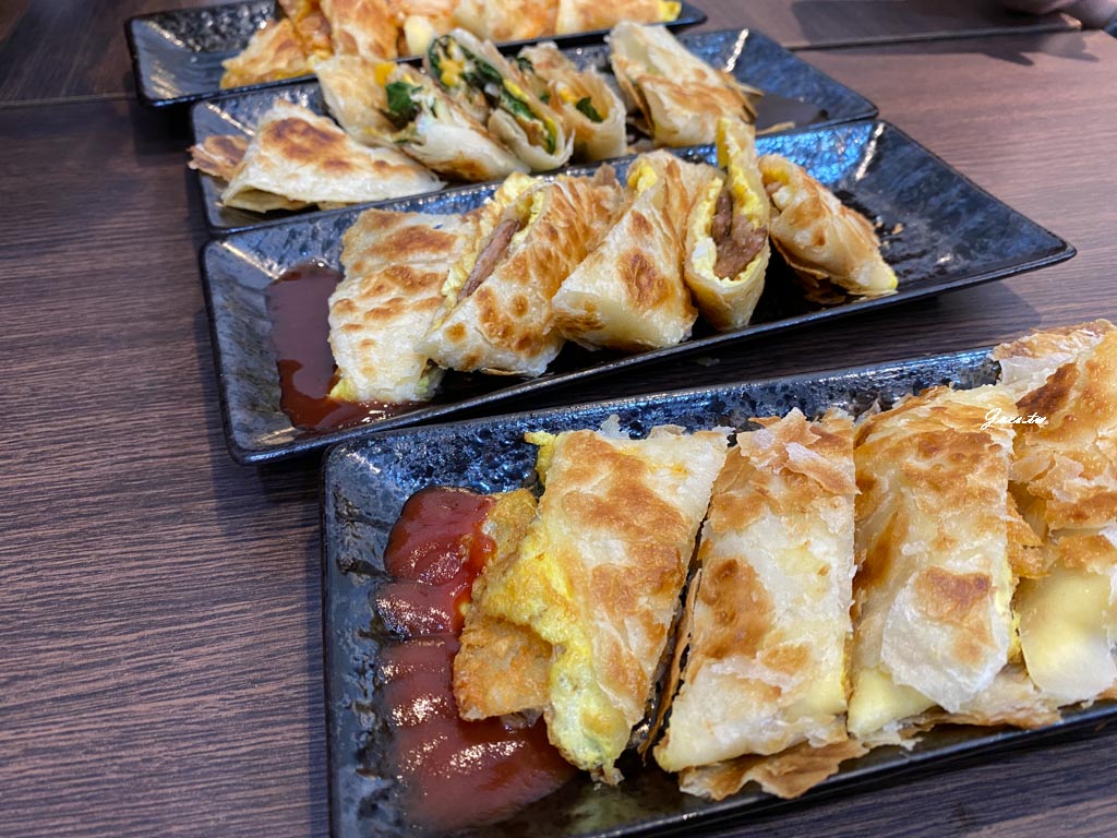 友人們來時點的蛋餅們是泡菜蛋餅(無醬)/薯餅蛋餅(蕃茄醬)/九層塔蛋餅加起士(醬油膏)/燒肉蛋餅(甜辣醬)額外跟店家索取特製辣。