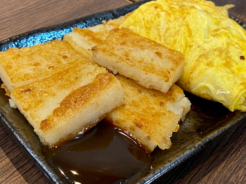 香酥蘿蔔糕+歐姆蛋+燒肉附大杯紅茶,歐姆蛋入口偏向濕潤版的家常散蛋裡面還有包裹起司。