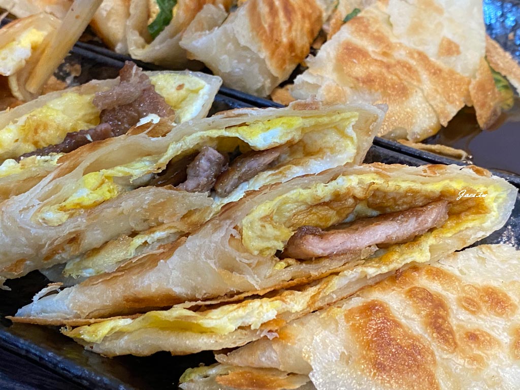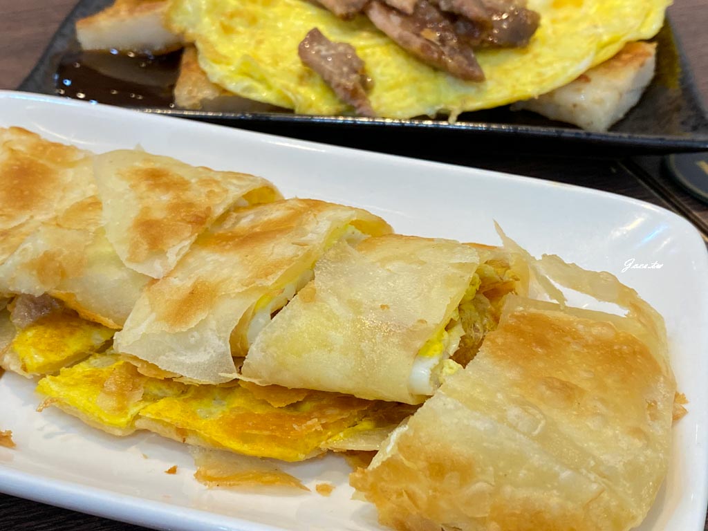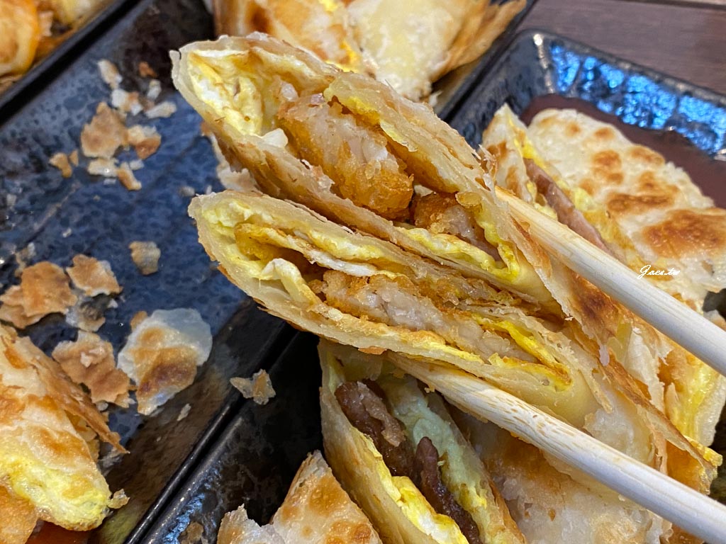 蛋餅外皮夾取時都能感受到能酥到掉渣,剛上桌餅皮略澎,放涼後會微平復。