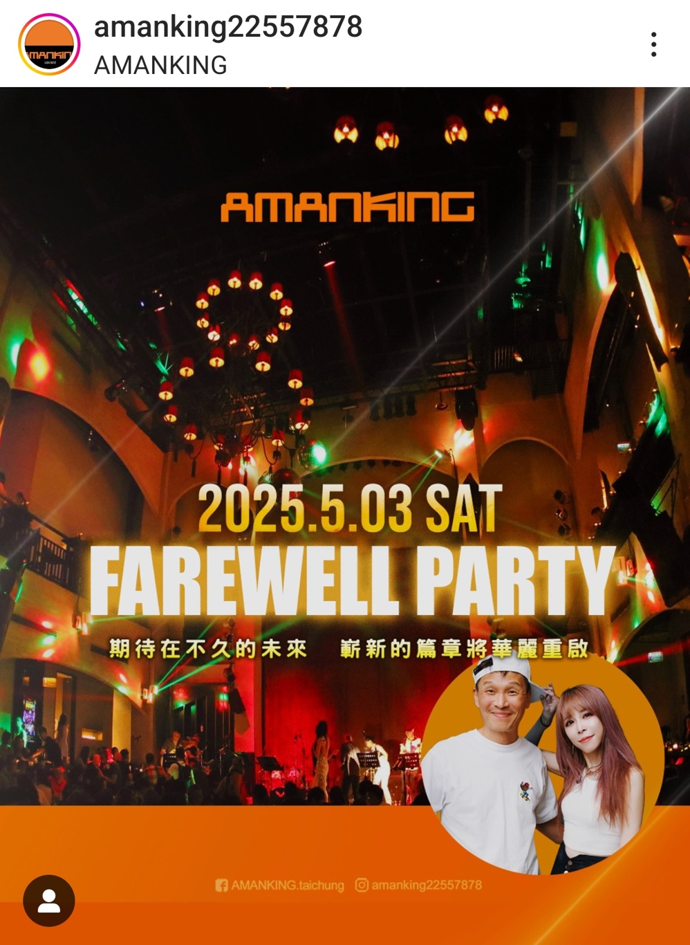 有20年歷史的台中夜店老字號-AMANKING在粉絲團IG上都公佈五月初要舉辦告別Party,現場LIVE BAND的熱鬧氣氛可以說是聞名全台!現址最後一晚的告別派對現在已開放預約~想要回味的朋友記得把握時間!