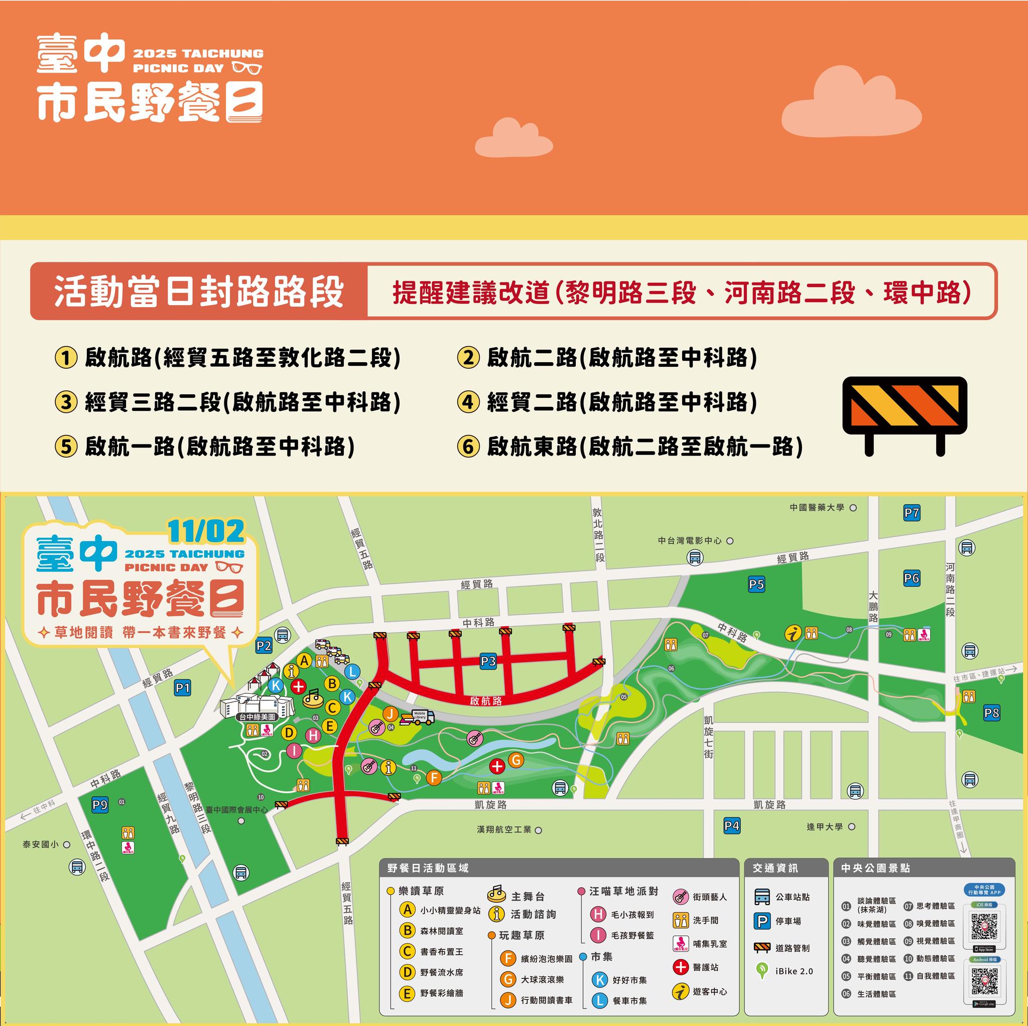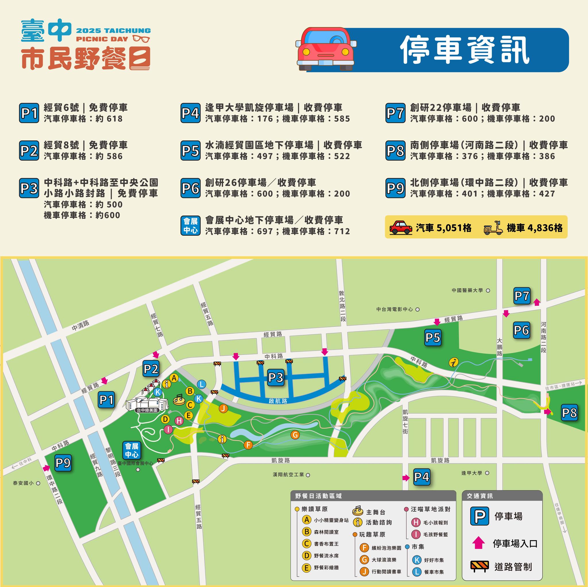 附上官方提供的停車資訊~還有相關的封路資訊,大家別忘了野餐完順帶到試營運中的綠美圖走一走!阿季之前有在粉絲頁上面介紹~現場真的很美,但是綠美圖是不能帶寵物進入的喔~這邊特別提醒一下!
