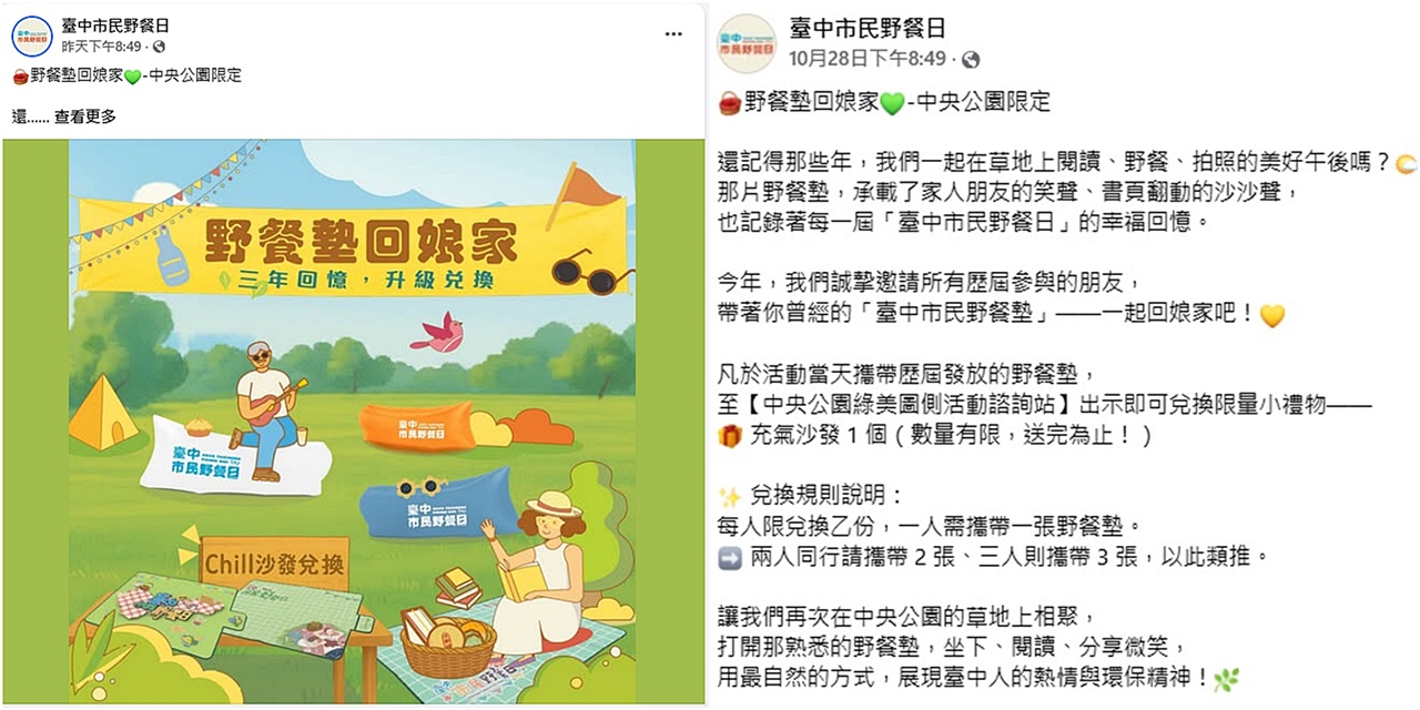 野餐日要在 11/2 登場啦~全台中 29個行政區同步舉辦,從山線到海線、從市區到屯區,每一區都有自己的野餐草地和主題活動!不論住哪裡~都能帶著野餐墊和一本書,在離家最近的公園裡~享受午後的陽光和微風。今年主題是"草地閱讀.帶一本書來野餐",邀請大家放下手機~靜下來感受自然與書香的陪伴。