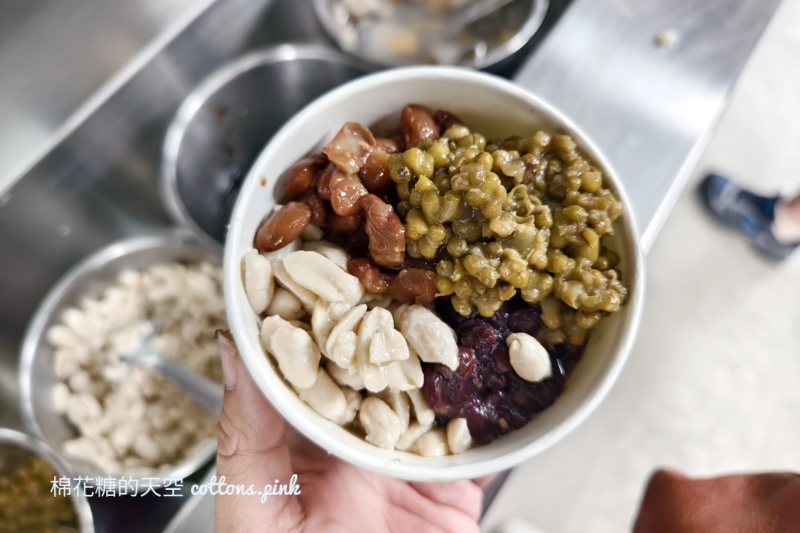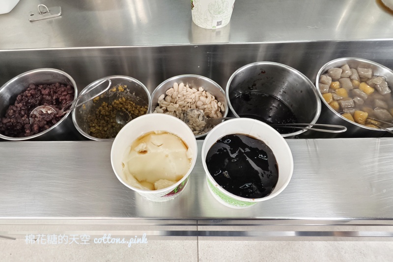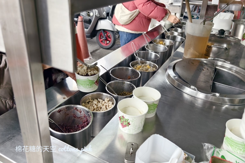 到店裡就是先選定要的是豆花還是嫩仙草,接著再把好料放進碗裡,雖然網路上大家都說可以直接裝到滿,但其實老闆娘是建議大家裝到九份滿就好~因為還要裝糖水,有一次冬天去的時候還可以加薑汁的唷!但我記得只有限定12月份~