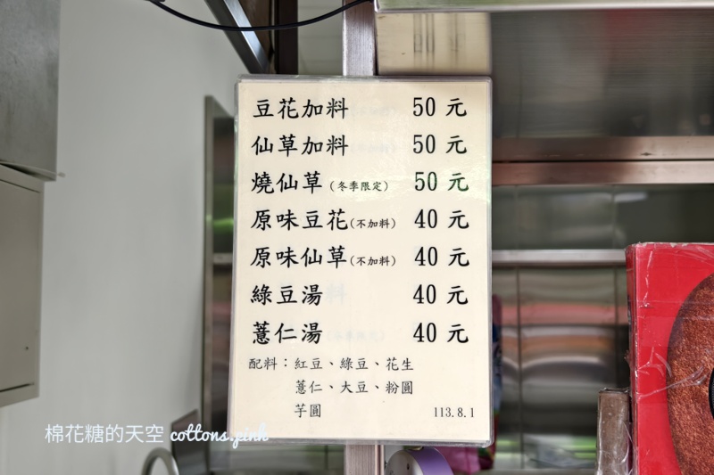 搬到店面之後價格一樣維持,現在一碗加料豆花已經來到50元了!但還是非常划算!話說他們家的仙草還真的超級嫩的~冬天竟然還有限定的燒仙草下次也要來吃吃看!