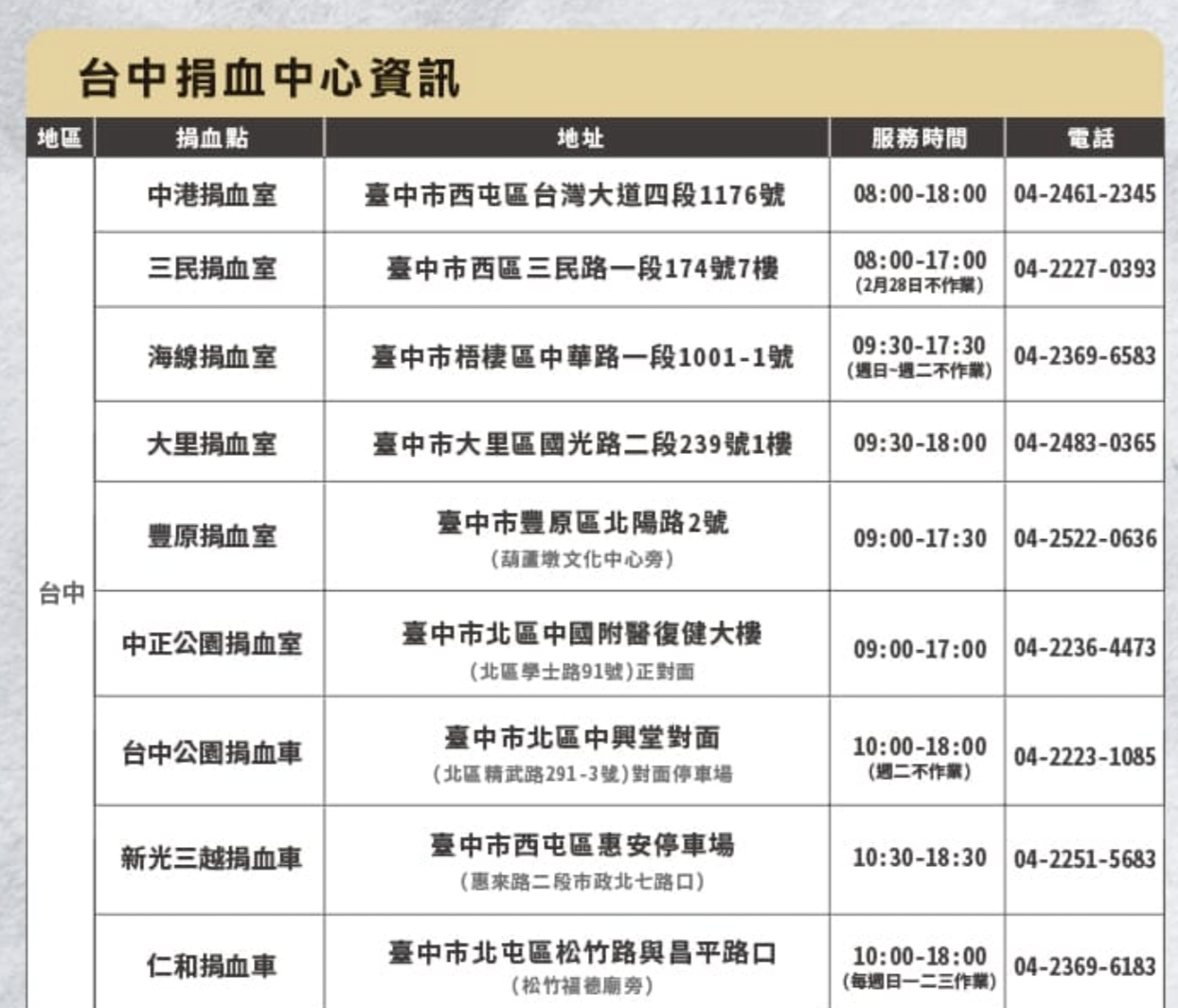 這次光是台中區配合捐血中心就有9個,不過營業的時間大部分跟上班時間也差不多~大家可以趁中午休息的時候出來捐血,假日人潮應該會更多可能需要等等唷~(部分捐血車或是捐血中心沒有每天營業大家要注意唷!)