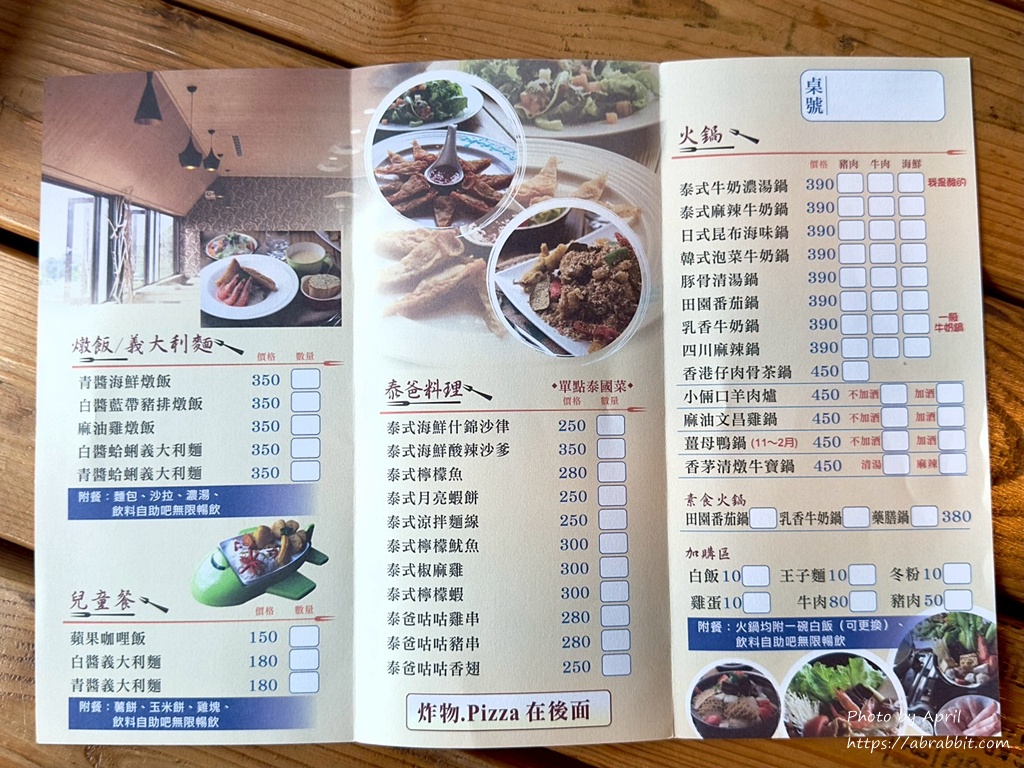 菜單的部分有兩面,有賣燉飯、義大利麵,單點的泰式料理、火鍋,還有兒童餐,也有炸物和pizza,選擇性很多。當天我們全家人點了火鍋和兒童餐還有薯條等炸物,跟孩子們一起分享。