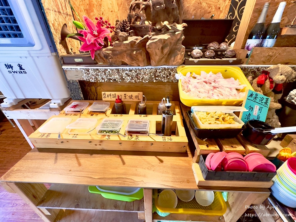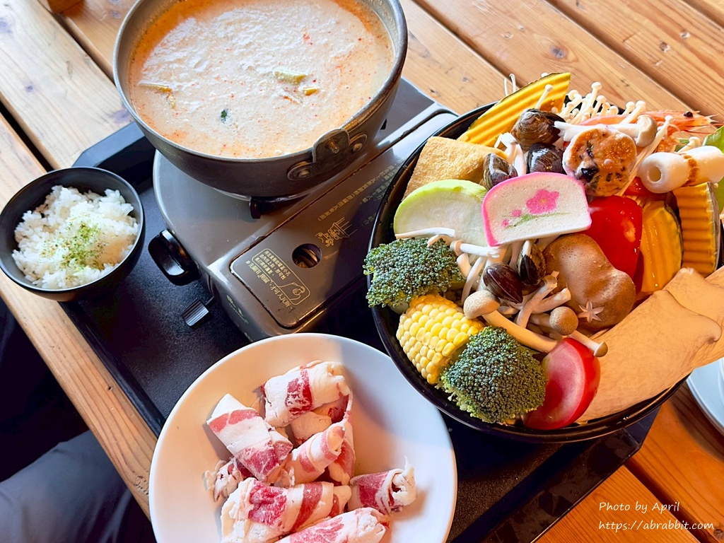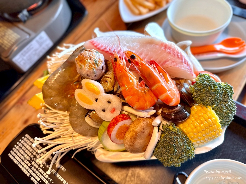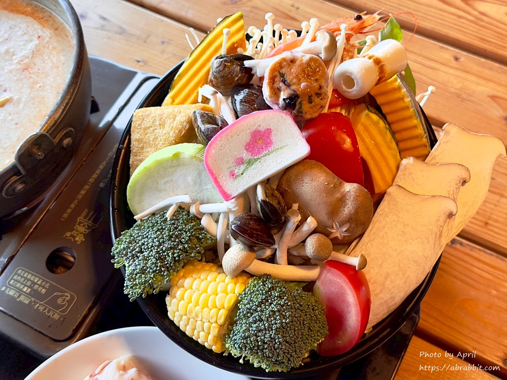 菜盤的部分出乎我意料之外,真的有夠多!這一鍋390元的火鍋,有這樣大份量的菜盤,有菇類、玉米、南瓜、花椰菜、番茄、絲瓜、起司丸、蝦子、油豆腐和一些火鍋料,豐富程度讓我讚嘆。而且還搭配這樣的景色與親子遊樂設施,跟一般的景觀餐廳或者親子餐廳相比,這個價位太親民,推薦!