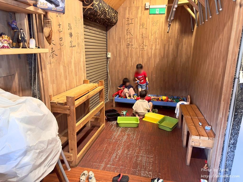 除了一樓有超寬闊的地區讓孩子們玩樂以外,二樓其實也有個小小的遊戲區,在這小小區塊裡面有積木和一些玩具,一邊用餐也可以讓孩子們在這邊玩耍,不用擔心!我們家寶貝也是玩得很開心呢。