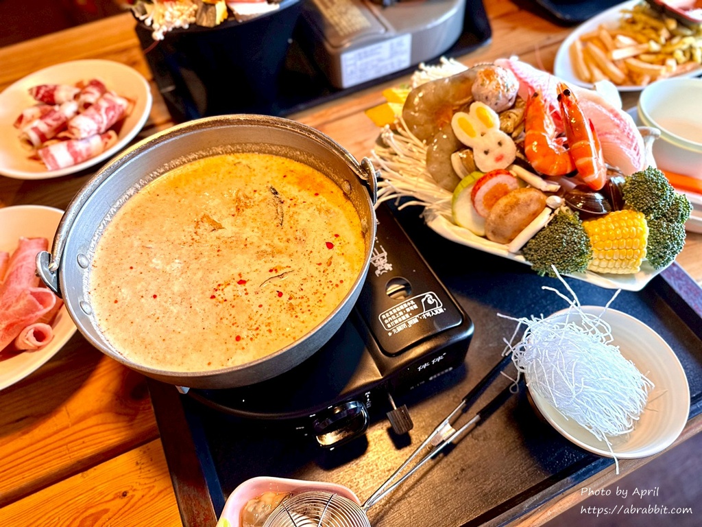 這個湯頭是比較重口味的,以牛奶為基底之後,加入泰式酸辣醬和香茅煮成的泰式牛奶鍋底!看得到湯頭上浮一層紅紅橘橘的油,但不要害怕其實不太辣。