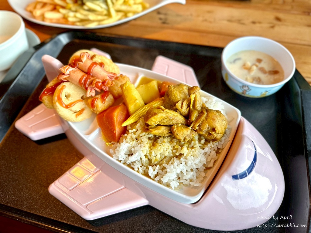 兒童餐有三種選擇,一種是蘋果咖哩飯,另外兩種是義大利麵。我選了蘋果咖哩飯,150元不貴!重點是,盛裝的容器超可愛,是小飛機,還附贈一碗湯。