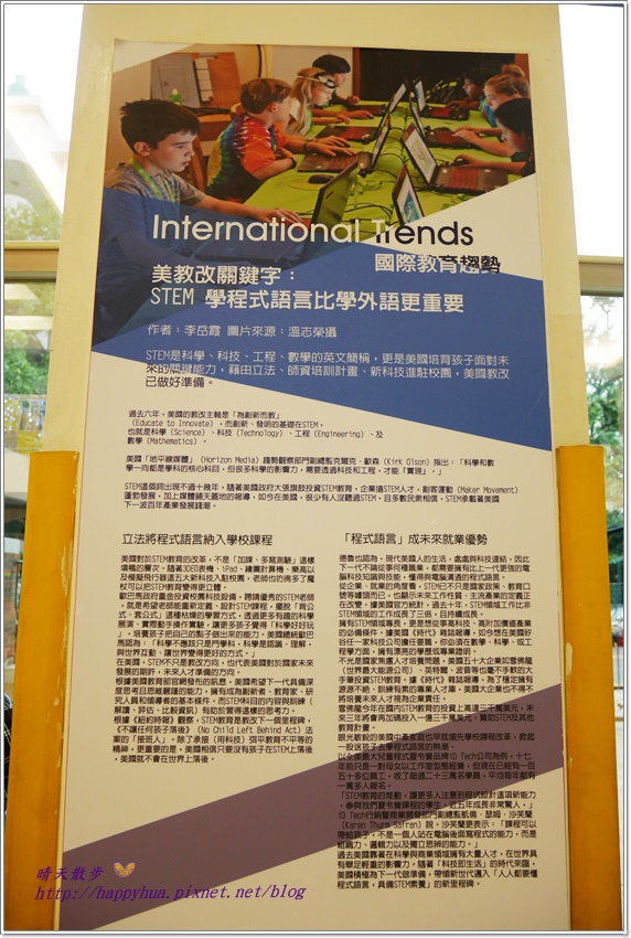 海報上說明國際教育趨勢~STEM教育(科學Science、科技Technology、工程Engineering、數學Mathematics),也是葳格的發展重點之一,期許能透過循序漸進的課程設計,培養孩子發現問題、解決問題的能力,以及人生道路上必備的挫折容忍力。