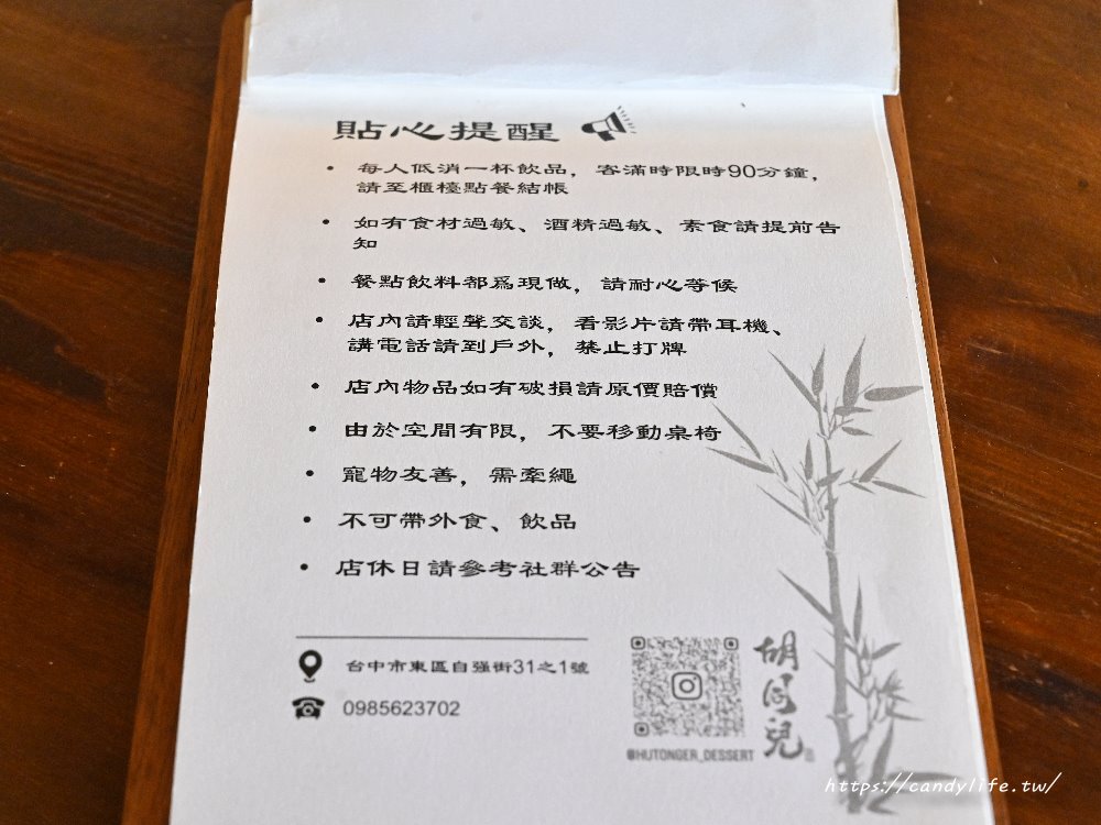 胡同兒每人內用一杯飲品,客滿時限時90分鐘,店內沒有提供訂位服務,甜點依當天為主,有焦糖布丁、巴斯克、提拉米蘇、肉桂捲等,品項還蠻多的