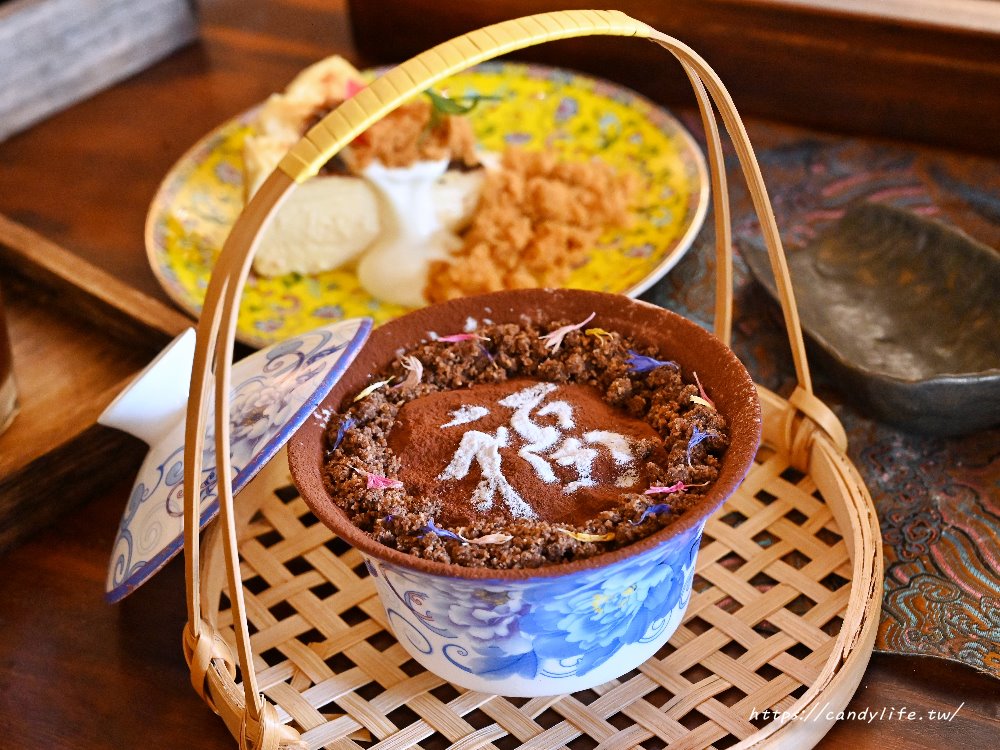 另一份甜點糖糖點了店內招牌宮廷蓋碗提拉米蘇,這應該是糖糖看過最宮廷風的提拉迷蘇了,也太美了!以宮廷蓋碗盛裝,打開裡面還藏驚喜,裡頭有個幅字,看起來就像個小花園,整體吃起來酒感比較濃厚些,甜度也稍微偏高了點