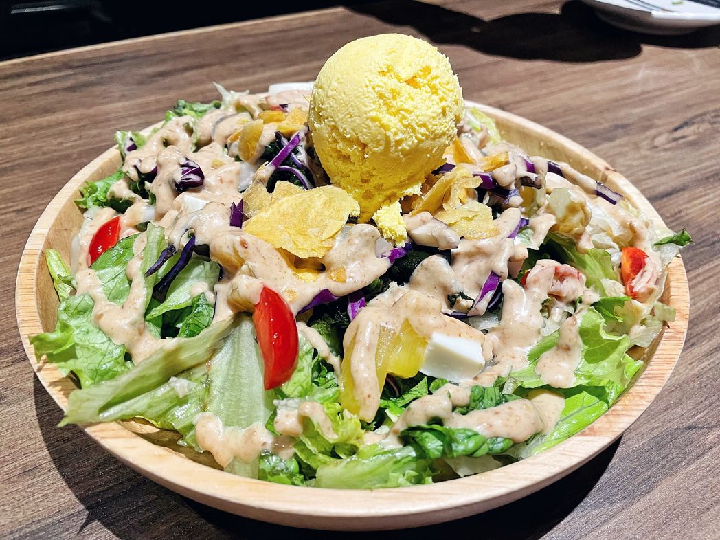 這道沙拉超級酷,上面金黃色一球店員說是芒果做成的冰淇淋,食用前要先均勻拌開,沙拉的醬汁是芝麻做成沙拉醬,香氣撲鼻,配上新鮮的生菜、豆腐、野菜整體非常爽口,很適合當開胃前菜