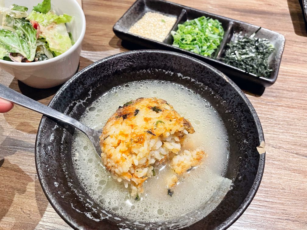 這大概是目前在台中吃到最有誠意的茶泡飯了!湯底是濃郁的雞高湯,喝起來清爽不膩,一旁還附贈一疊白芝麻、新鮮蔥花和海苔絲,想要什麼就自己加,重點是飯糰居然也是有炙燒過的,表層帶點焦脆感和炙燒香氣,全部一起搭配吃超級過癮