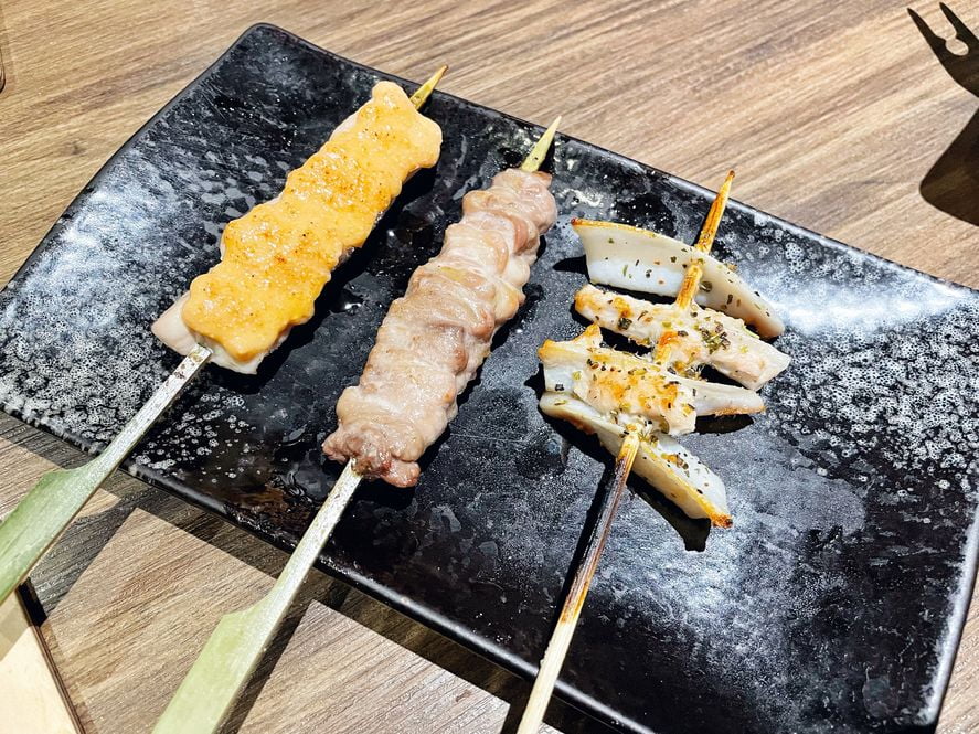 我自己偏愛雞菲力烤串,居然有明太子、芥末美乃滋、柚子胡椒、紅玉味噌四種口味可以選,我們選了明太子醬,鹹甜中帶點微辛辣感配上軟嫩有彈性的雞肉非常好吃,雞頸肉也是第一次嘗試烤串的料理方式,沒有過多的調味,炙烤後簡單撒上鹽巴,一口咬下還保有肉汁,跟一般的串燒相比更加清爽不膩