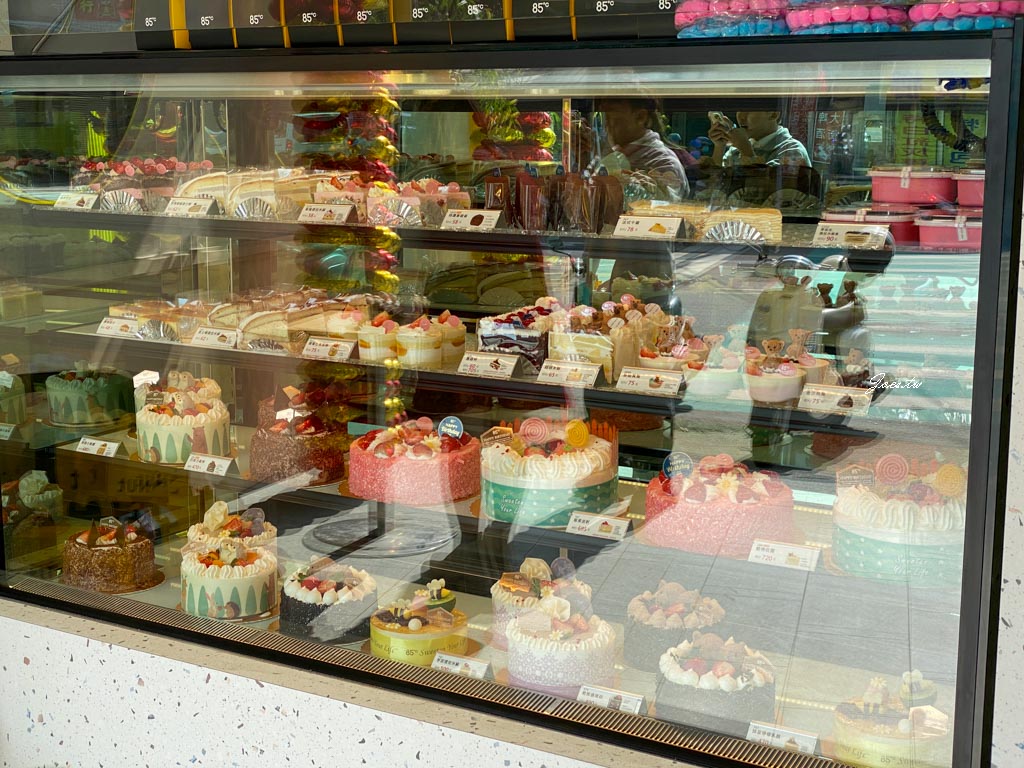 店內陳列分明:大型冷藏玻璃櫃擺滿了 85 度C 原本的各式蛋糕,而小型冷藏櫃則專門放著各種爆漿生甜甜圈,整齊排列,讓人一眼就能挑選喜歡的口味。