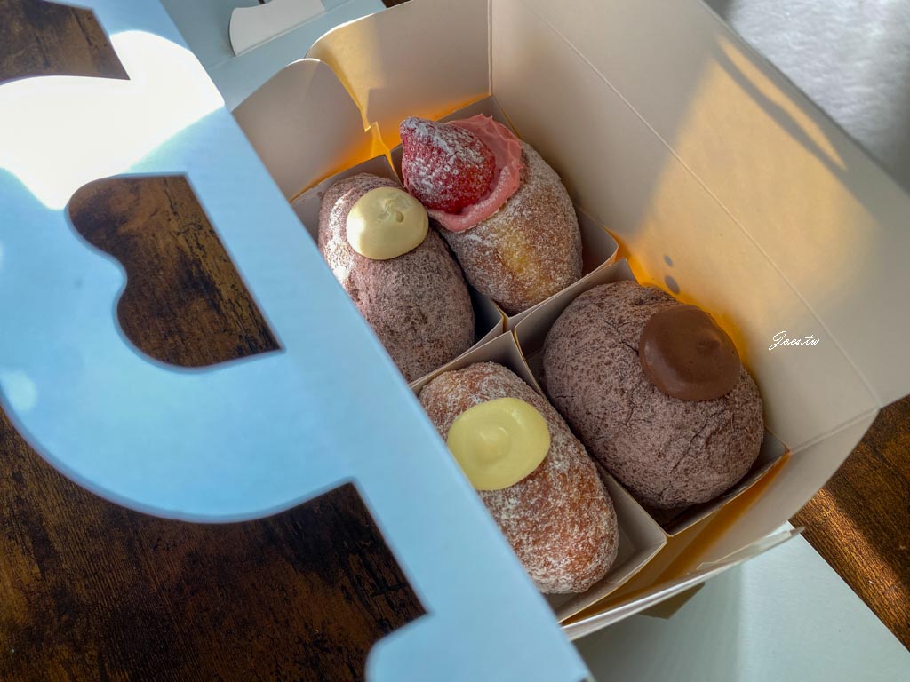 外皮吃起來是柔軟有彈性的麵包口感,入口濕潤略有嚼勁每款都有撒防潮糖粉。