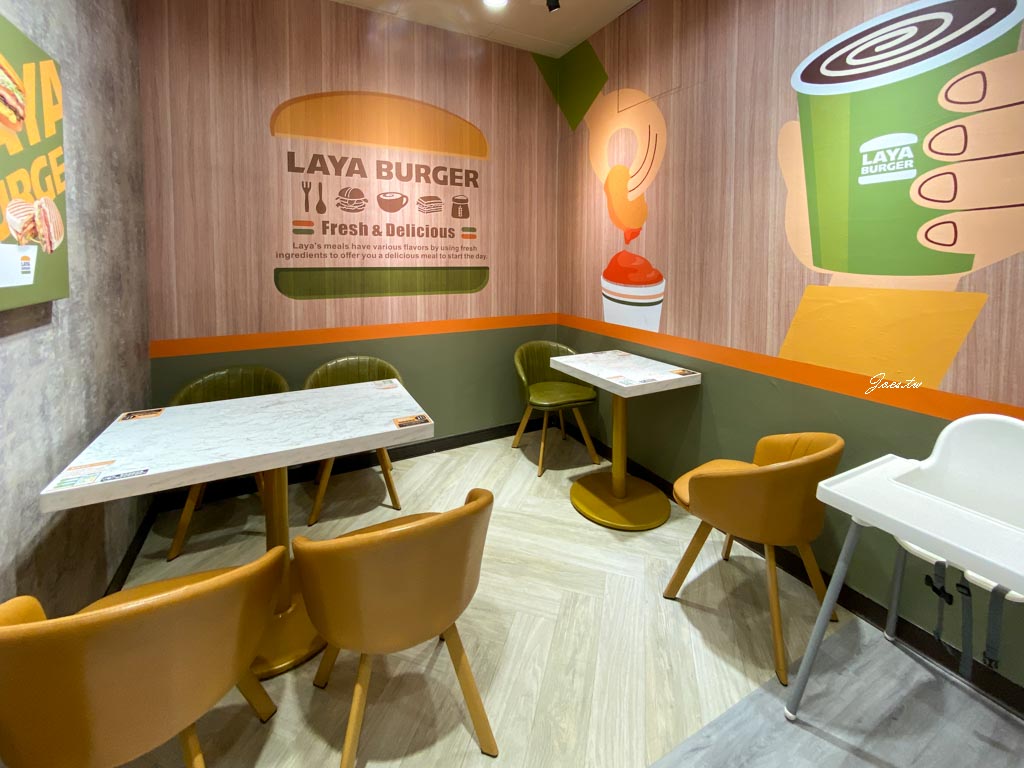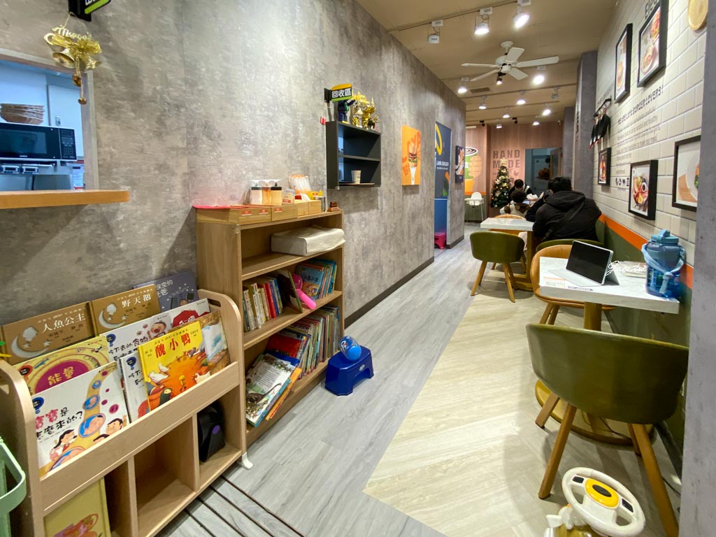 店內整體裝潢以品牌識別為主軸,店內最後方的座位區有放置兒童座椅與提供廁所。
