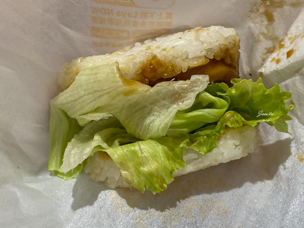 照燒風味的米漢堡調味不陌生,米飯口感偏紮實,咀嚼時有煎香的米粒會稍微硬實些像鍋巴感,但還算是好入口,裡面的肉塊是帶皮雞腿。