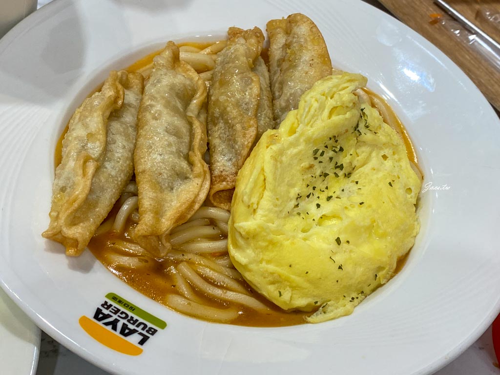 煎餃外皮酥脆內部有汁 內料中規中矩;蘑菇烏龍麵基底則是帶了蕃茄醬的氣息,一旁的歐姆蛋本身沒什麼調味的感受,也可是先吃了烏龍麵與煎餃,對歐姆蛋本身味道沒什麼記憶點。