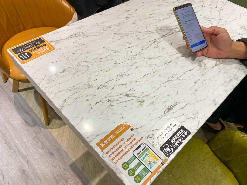 桌上都有寫用餐流程,入內後先至櫃台取號碼牌上面有QR Code,用來掃碼點餐與自助取餐使用,用餐完畢自行回收餐具。