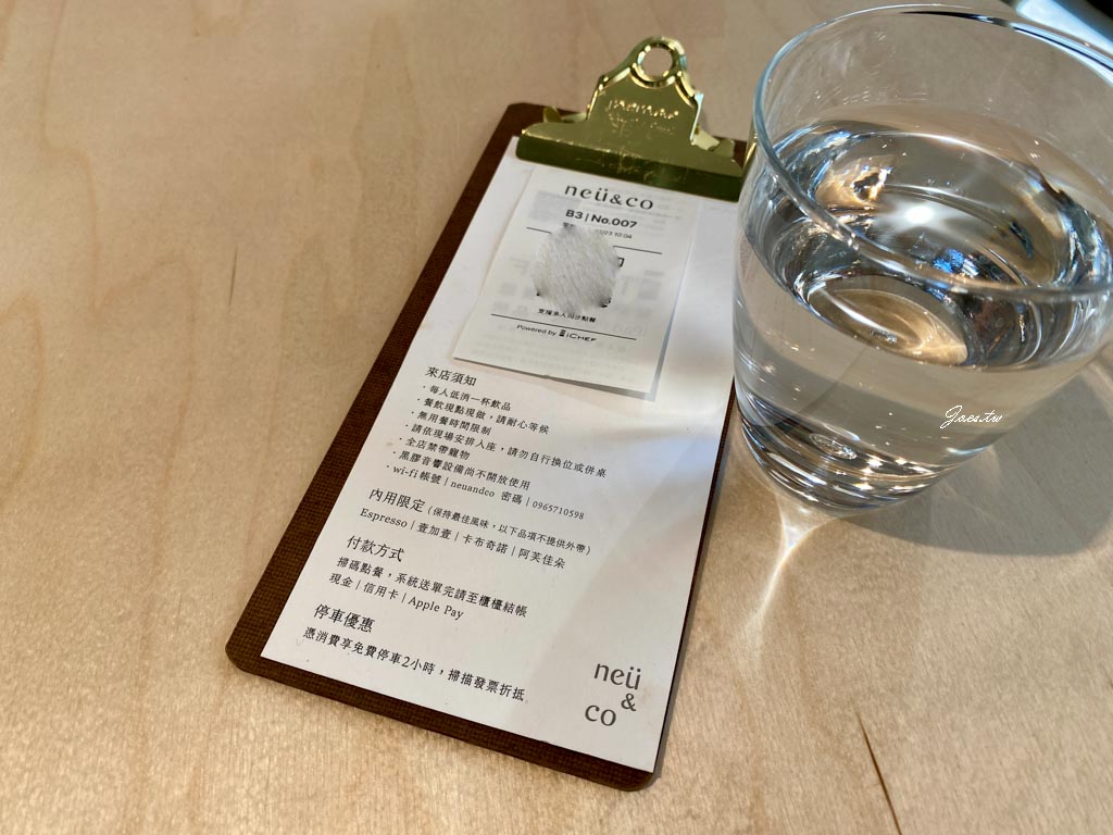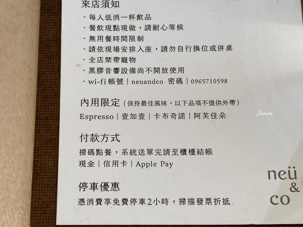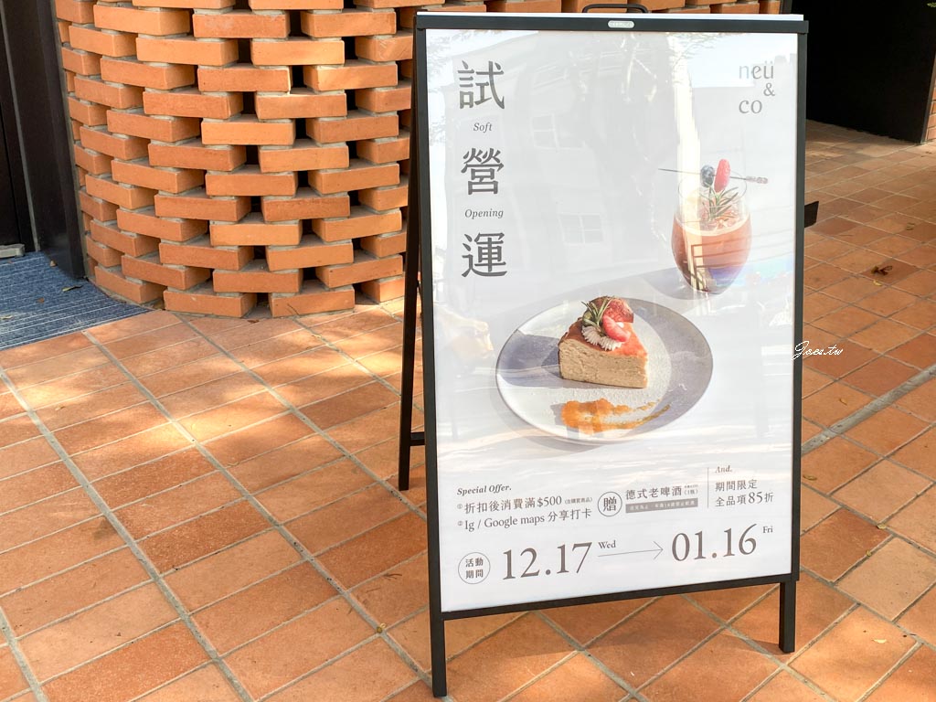 neü & Co. Café位於新興路的昕昕裏山大樓的店面區,附近較明顯的地標是位於同側的春風稻(約150公尺左右),開車來的朋友除附近路邊停車外,店側有特約的小型收費停車場。