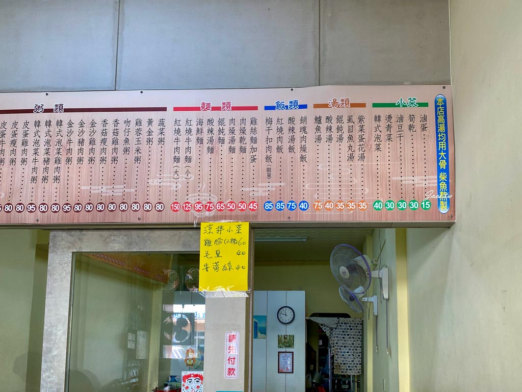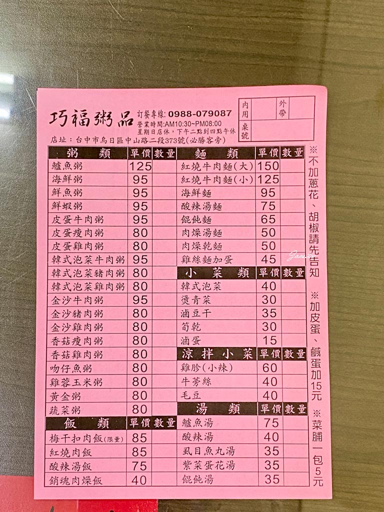 櫃台處則有擺放紙本菜單,有粥類/麵類/小菜/涼拌小菜類/飯類/湯類等,上頭也有備註可客制化不加蔥花或胡椒等還有加購的選擇。