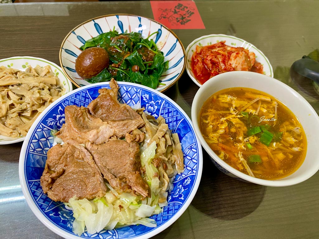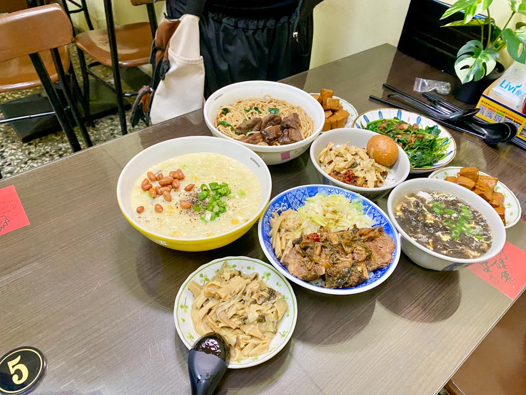 這張是香菇雞肉粥/梅干扣肉飯/銷魂肉燥飯/紅燒牛肉麵(大)/燙青菜/滷豆干*2/筍乾/滷蛋/紫菜蛋花湯。
