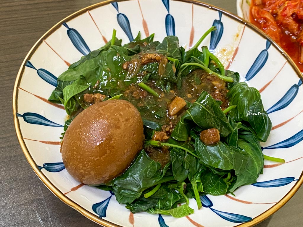 燙青菜這次提供的可選高麗菜或地瓜葉,滷蛋口感紮實入味。