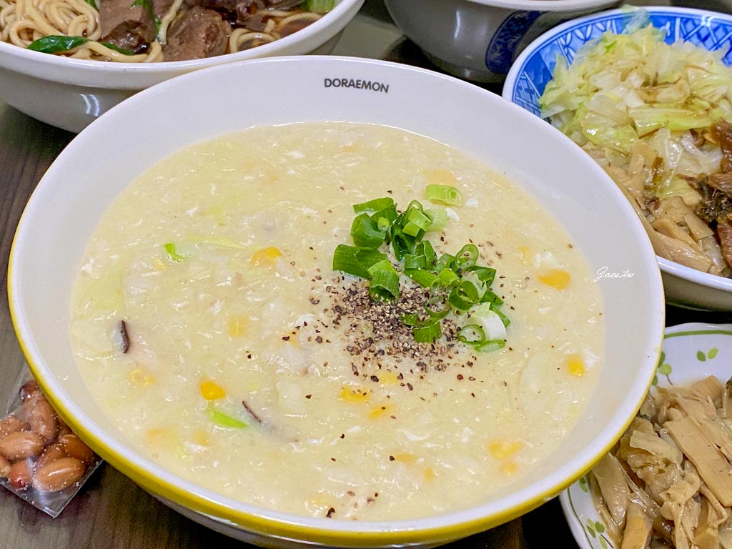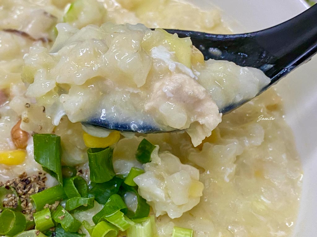 香菇雞肉粥每一口都能舀到不同食材,玉米、香菇、高麗菜與雞丁交錯其中,米粒已煮成粥,口感細緻順滑。