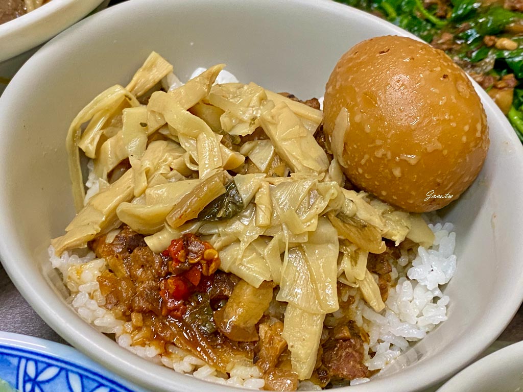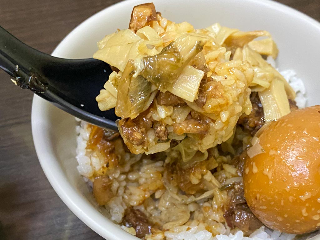 肉燥飯的肉燥鹹香十足,本體是帶有肥肉的肉角塊,油脂香氣飽滿,同時保有瘦肉口感。