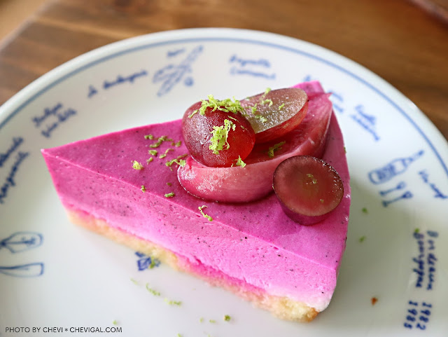 東海原來有間名字有點文青的甜點店!鮮豔的火龍果黑醋栗生乳酪,仔細一看,會發現側面還有著淡淡的美麗漸層。生乳酪的綿密口感幾近慕絲,火龍果本身沒有太多味道,主要是豐富了視覺上的色彩,而且還能看得到黑色籽的顆粒;黑醋栗的微酸,搭配生乳酪的濃郁,使得口感更加輕盈。上頭的無籽葡萄和水蜜桃,吃得出來不是罐頭水果,撒上鮮綠的檸檬皮也很清新。