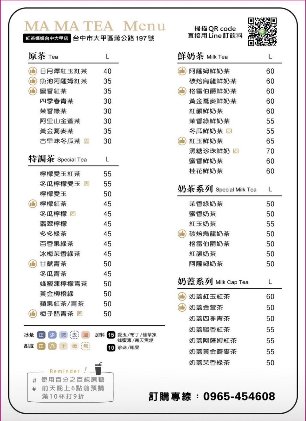 來到大甲商圈,不再只有傳統的小吃選擇,「紅茶媽媽」憑藉著自種台茶18號的硬實力,讓每一杯手搖飲都喝得到職人的用心。無論是果香馥郁的草莓系列、清爽回甘的單茶系列,還是那層厚實綿密的海鹽奶蓋,多樣化的選擇絕對能滿足挑剔的味蕾,另外店家也不定期推出新品與期間限定優惠,趁著優惠期間趕快來試試新口味吧!